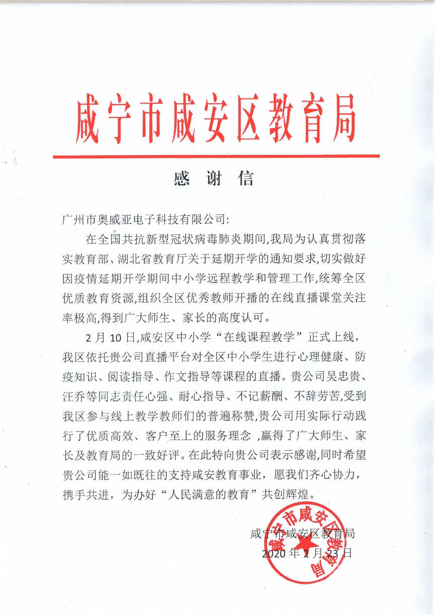 截至2月21日,咸安区在线教学累计点击量约299.8万人次,服务学生7万人。奥威亚服务团队的快速响应能力、尽职尽责的服务精神,获得了用户的高度肯定。咸宁市咸安区教育局专门发送感谢信,赞扬奥威亚服务团队用实际行动践行优质高效、客户至上的服务理念。