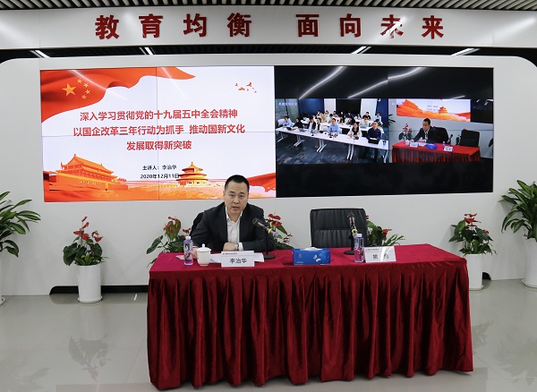 12月11日下午,中文发集团党委委员、副总经理李治华以“深入学习贯彻党的十九届五中全会精神,以国企改革三年行动为抓手,推动国新文化发展取得新突破”为题讲授专题党课。