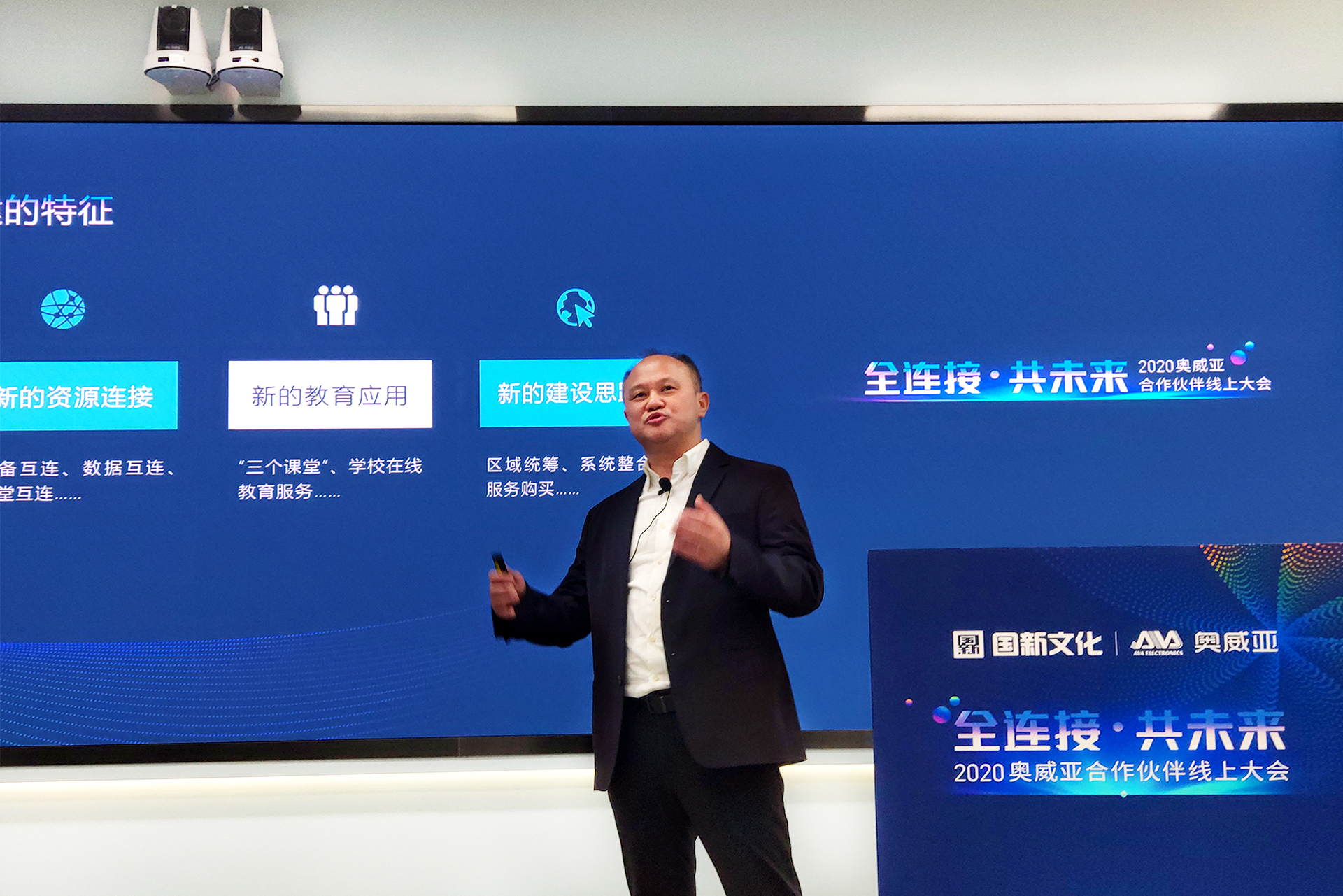 随着会议不断推进,迎来了此次会议的高潮—“2020年奥威亚新品发布”。此次会议主要发布了奥威亚两款新产品:“一体式交互录播”与“全连接教学平台”。