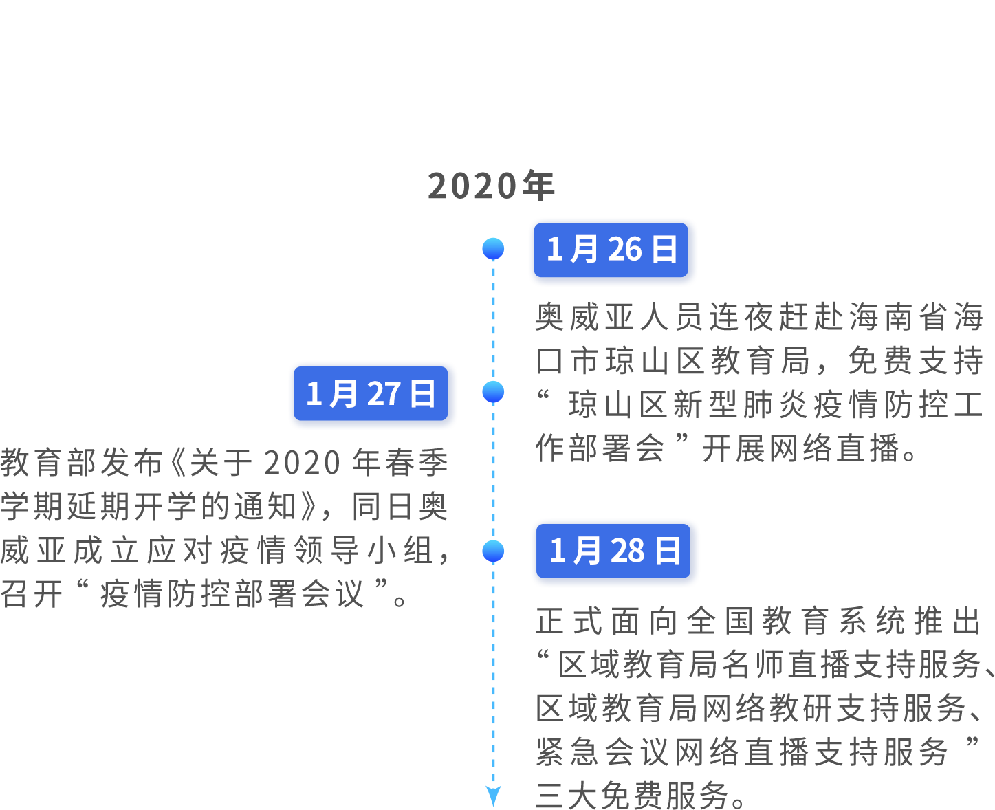 自三大服务推出以来,截至2月19日,奥威亚已为27个省的240个区县开展13443场直播,连续22日无故障运行,累计惠及数百万学生。