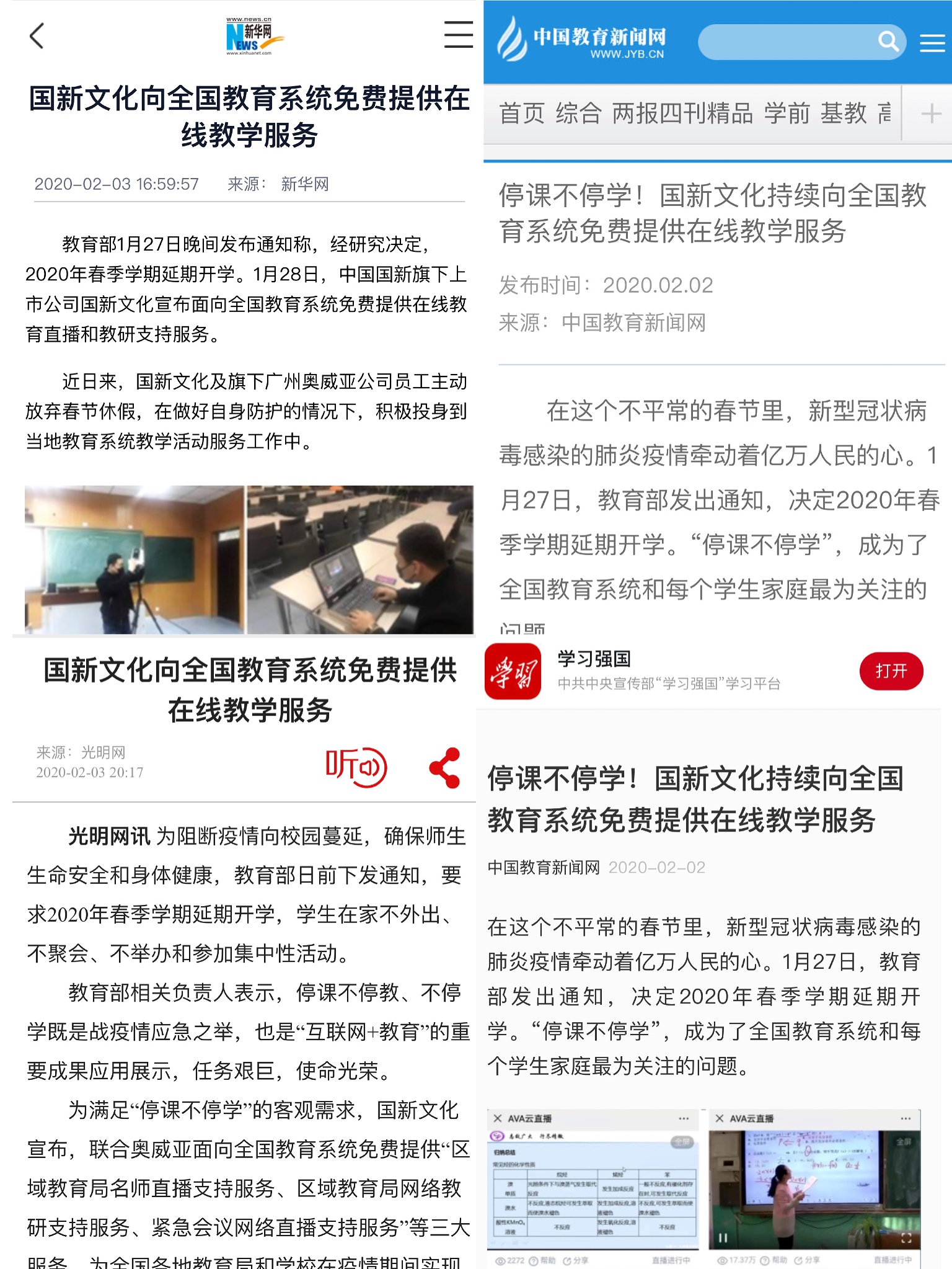 截至目前,国新文化及奥威亚战“疫”免费服务已获得包括新华社、光明网、中国经济网在内的中央主要新闻媒体,学习强国app、中国教育报等党建、教育权威媒体的宣传推介。其中,光明日报所属光明网登署名文章,指出奥威亚的三大服务既是战疫应急之举,也是“互联网+教育”的重要成果应用展示。