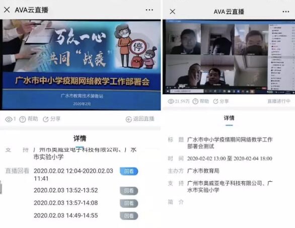 契合教育局要求,结合本地学生情况开展。1月29日接到湖北省广水市教育局关于开展“广水市中小学疫情期间网络教学工作部署会议”的网络直播需求后,奥威亚第一时间安排技术人员提供远程服务。2月3日,通过奥威亚录播设备,广水市教育局顺利召开网络视频会议。市中小学校长、中层干部、学校信息管理员及各学科骨干教师近500人通过奥威亚免费提供的“紧急会议网络直播支持服务”,在“人员不聚集”的前提下,借助手机终端远程参与,共同学习探讨网络教学工作要求及操作要领,为“停课不停学”工作有序开展提供了有力保障。会议直播点击量360000人次,同时在线人数最高达5000余人。