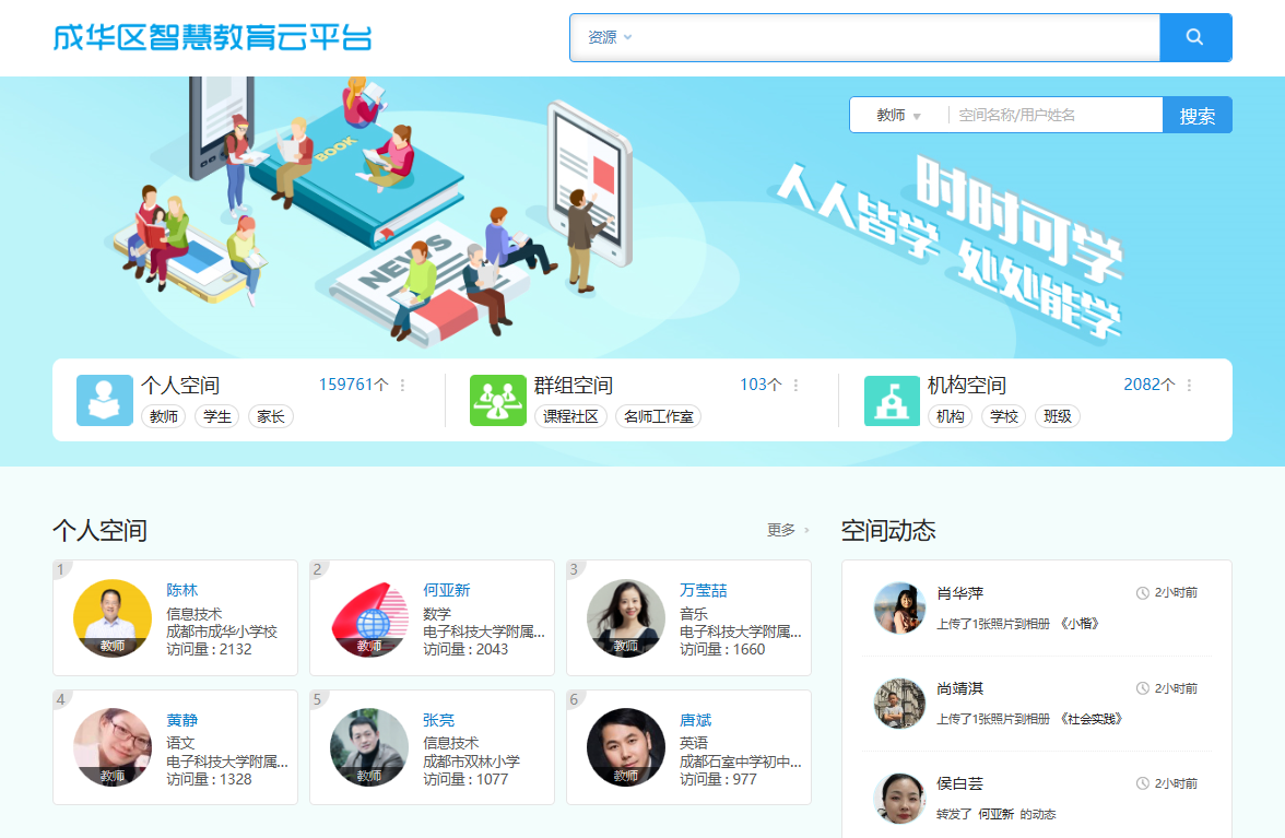 截至发稿,依托成华区智慧教育云平台,共计开通了64个学校空间、1999个班级空间、6452个教职工空间、91671个学生空间及各类机构空间,配合移动端“人人通空间”APP,实现了PC端和移动端个人空间和机构空间的信息、资源和应用互通共享。