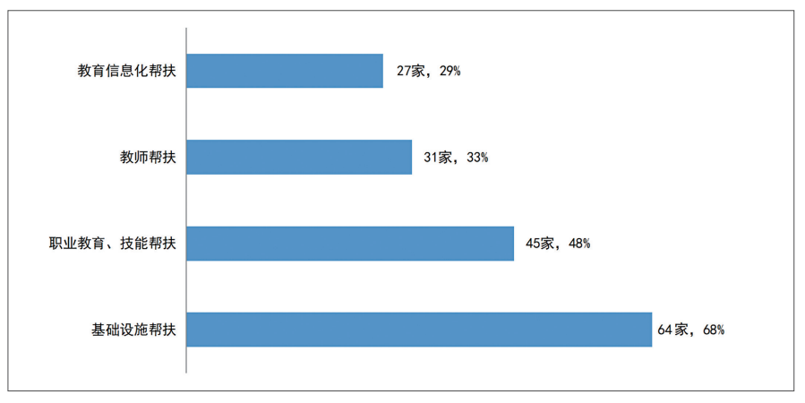 据统计,在 98 家国资央企中,有 94 家央企实施了教育帮扶,帮扶范围涵盖基础教育、职业教育,少部分涉及学前教育、特殊教育,帮扶内容包括基础设施帮扶、职业教育技能帮扶、教师帮扶、教育信息化帮扶。